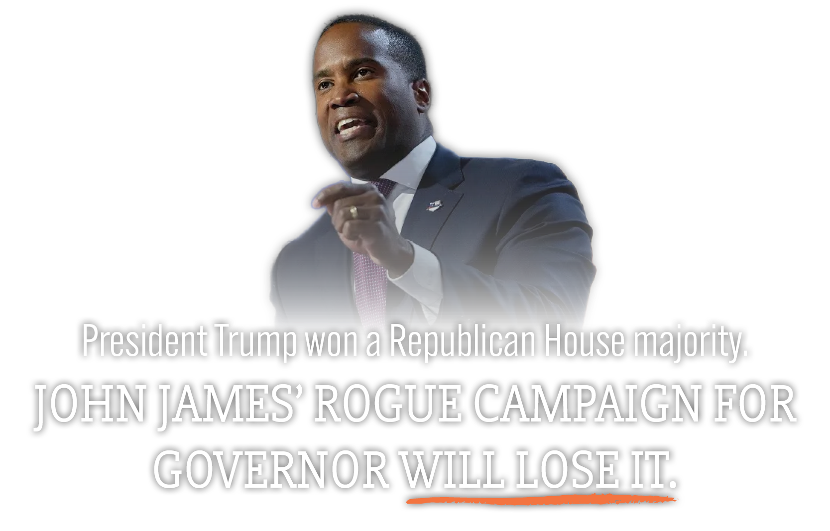 President Trump in 2024 didn’t just win back the White House. He led candidates like John James to victory in tough races that restored Republican majorities in Congress and put the America First Agenda into action. Now, when President Trump needs America First Republicans to protect its majorities from a radical Left takeover, John James has gone rogue–abandoning his critical Congressional seat for a self-serving, long-shot campaign for governor.